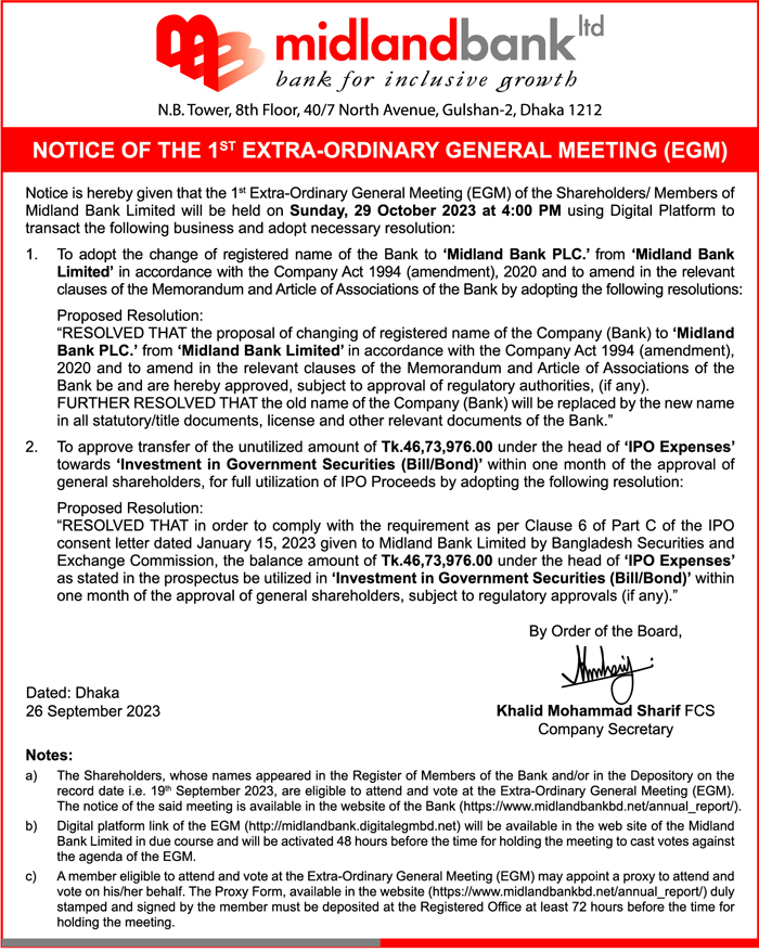Notice of the 1st EGM of Midland Bank Limited