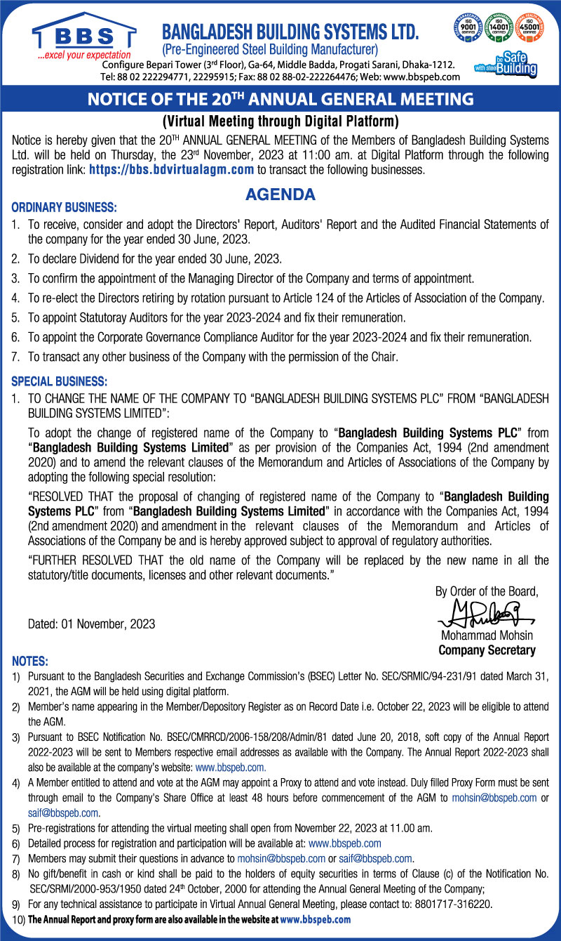 Notice of the 20th AGM of Bangladesh Building Systems Ltd.