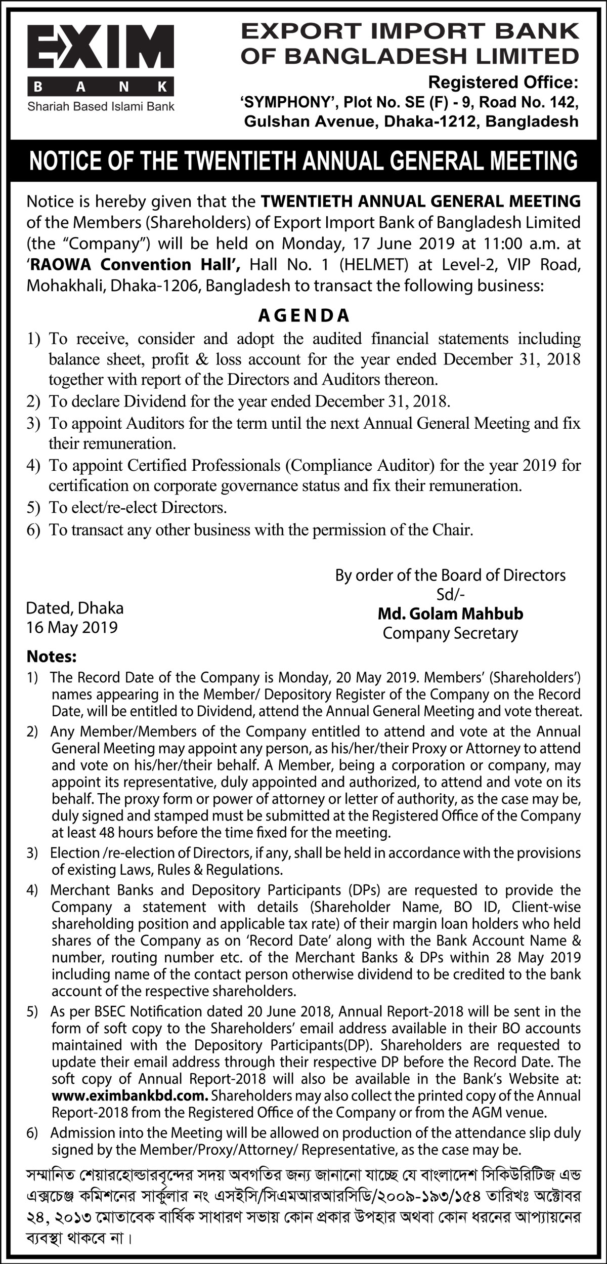 Notice of the 20th Annual General Meeting of EXIM Bank Limited