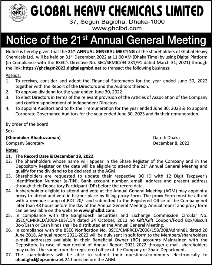 Notice of the 21st AGM of Global Heavy Chemicals Limited