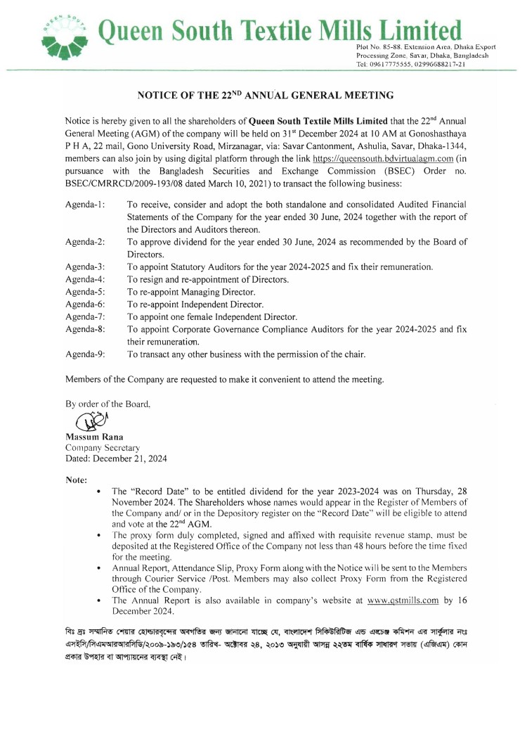 Notice of the 22nd AGM of Queen South Textile Mills Ltd.
