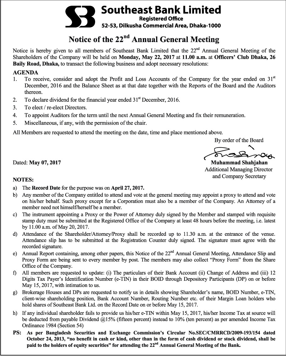 Refixation of Date of the 29th AGM of Southeast Bank PLC