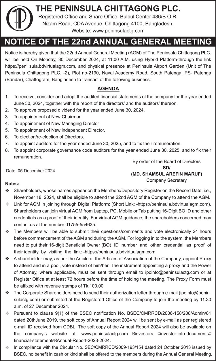 Notice of the 22nd AGM of The Peninsula Chittagong PLC.