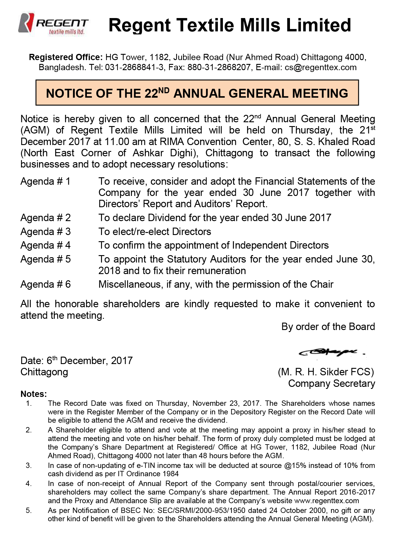 Notice of the 22nd Annual General Meeting of Regent Textile Mills Limited