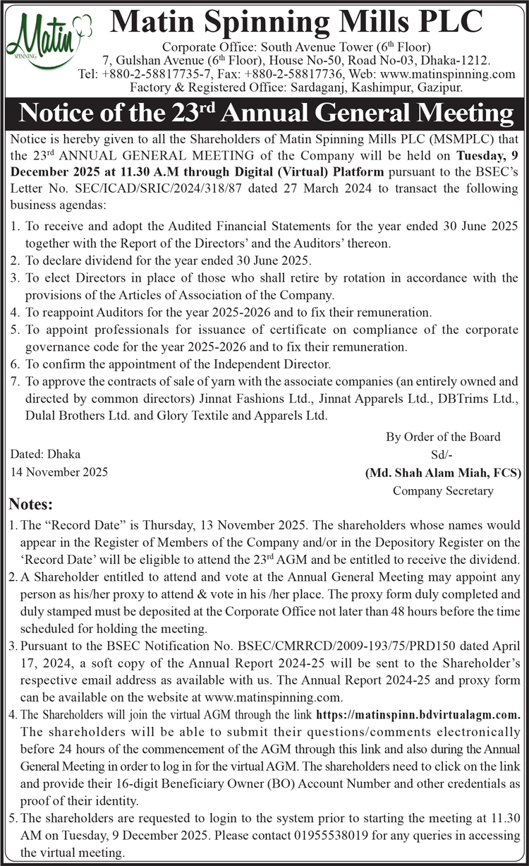 Notice of the 23rd AGM of Matin Spinning Mills PLC