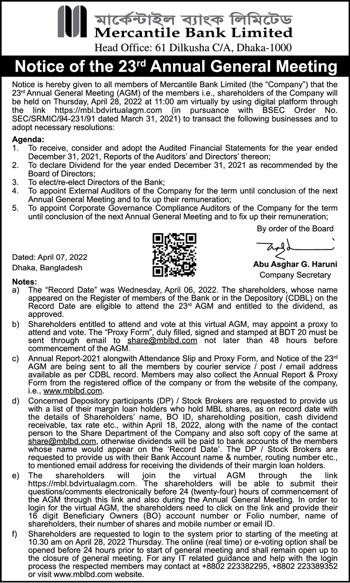 Notice of the 23rd AGM of Mercantile Bank Limited.