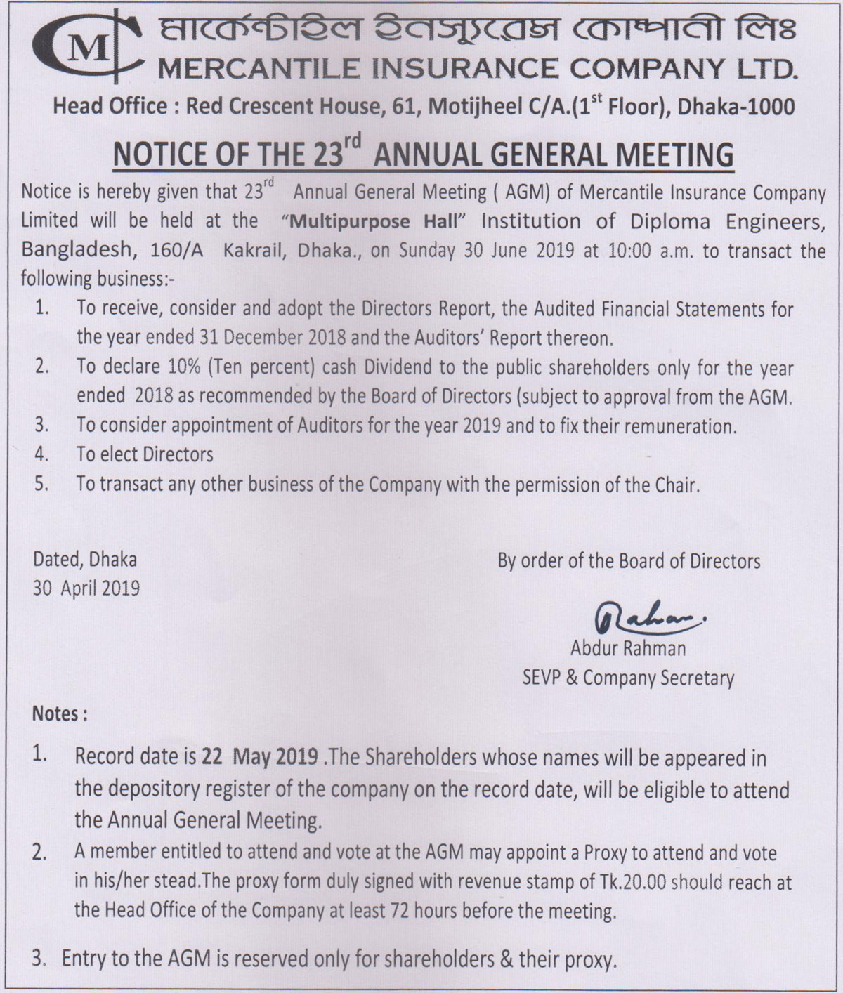 Notice of the 23rd AGM of Mercantile Insurance Co. Ltd