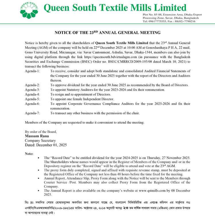 Notice of the 23rd AGM of Queen South Textile Mills Ltd.