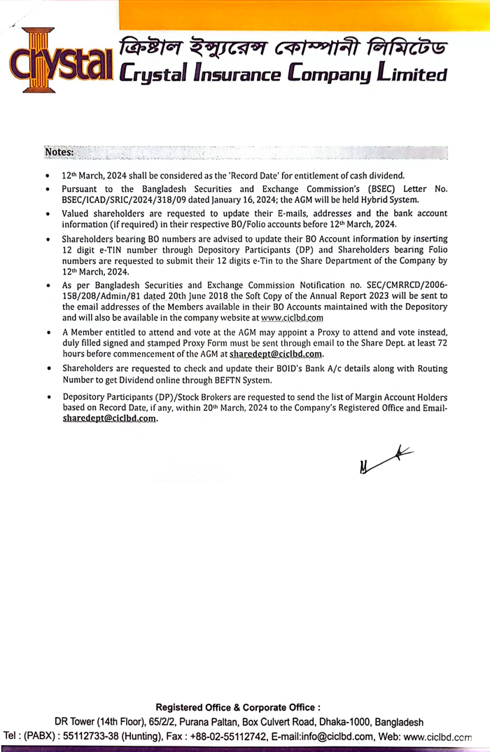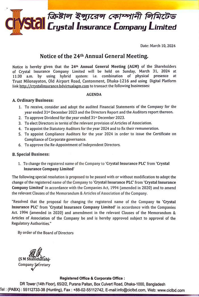 Notice of the 24th AGM of Crystal Insurance Company Limited