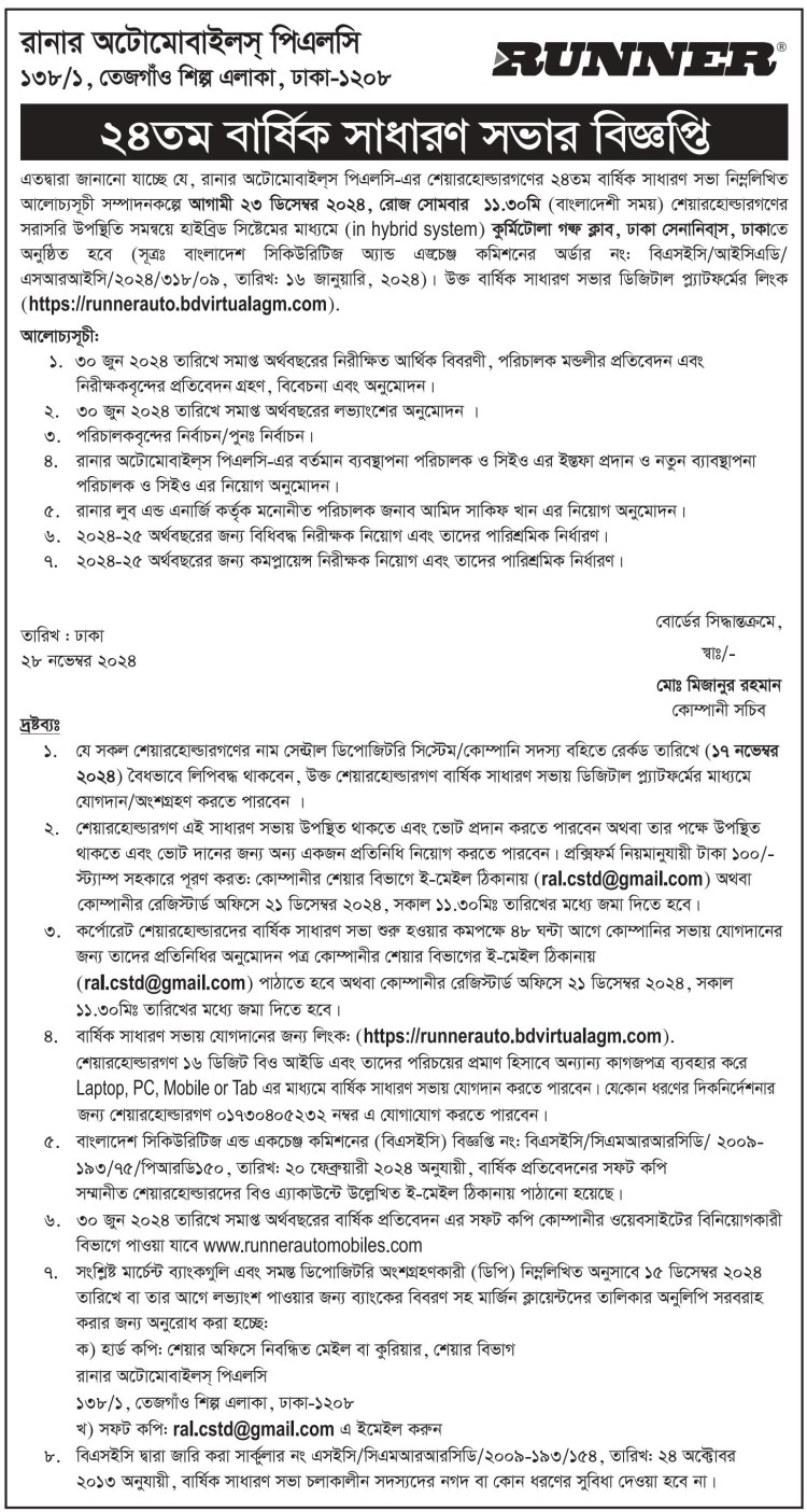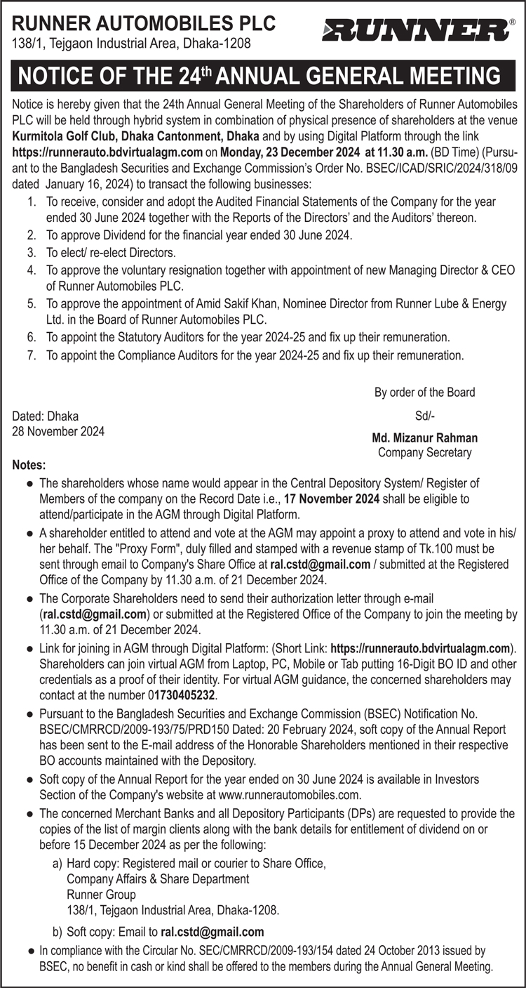Notice of the 24th AGM of Runner Automobiles PLC