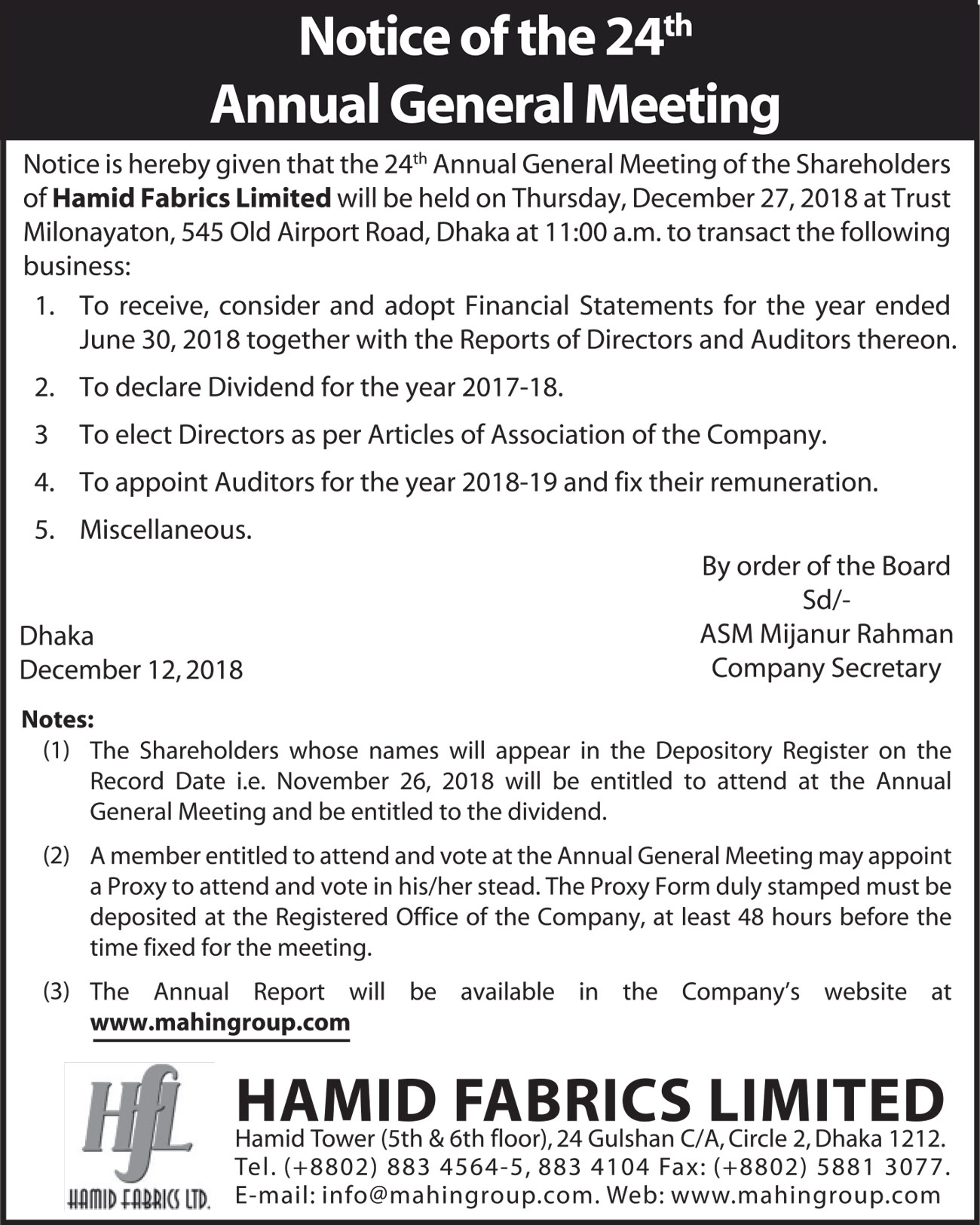 Notice of the 27th AGM of Hamid Fabrics Limited