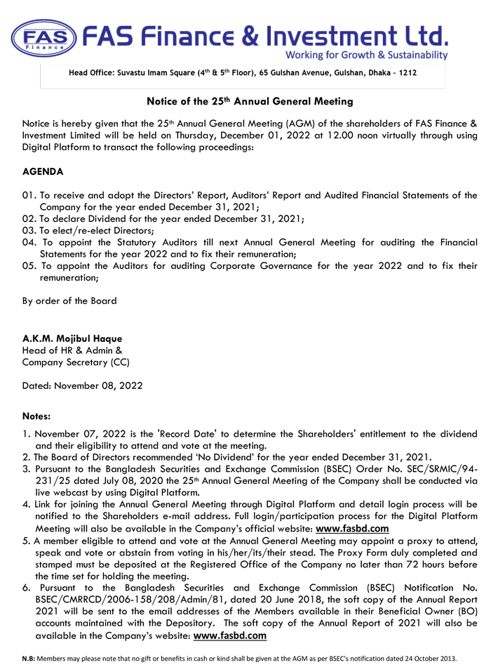 Notice of the 25th AGM of FAS Finance & Investment Limited