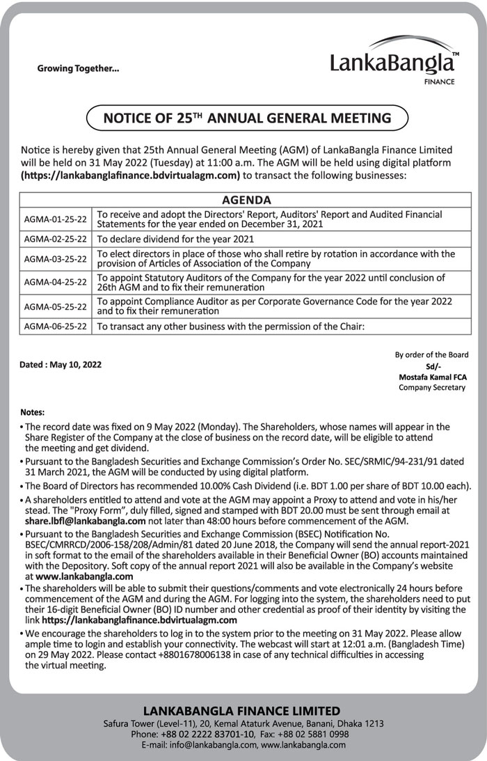 Notice of the 25th AGM of LankaBangla Finance ltd