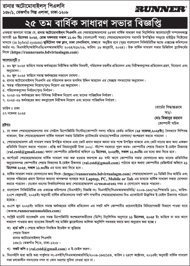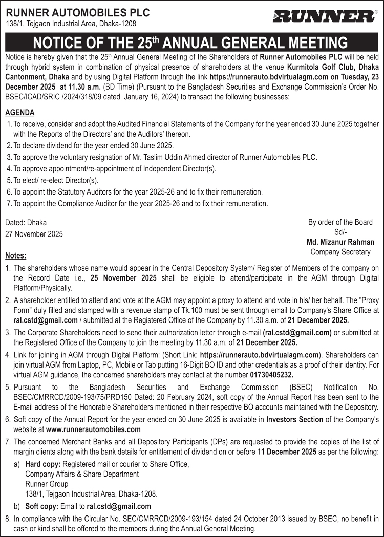 Notice of the 25th AGM of Runner Automobiles PLC.