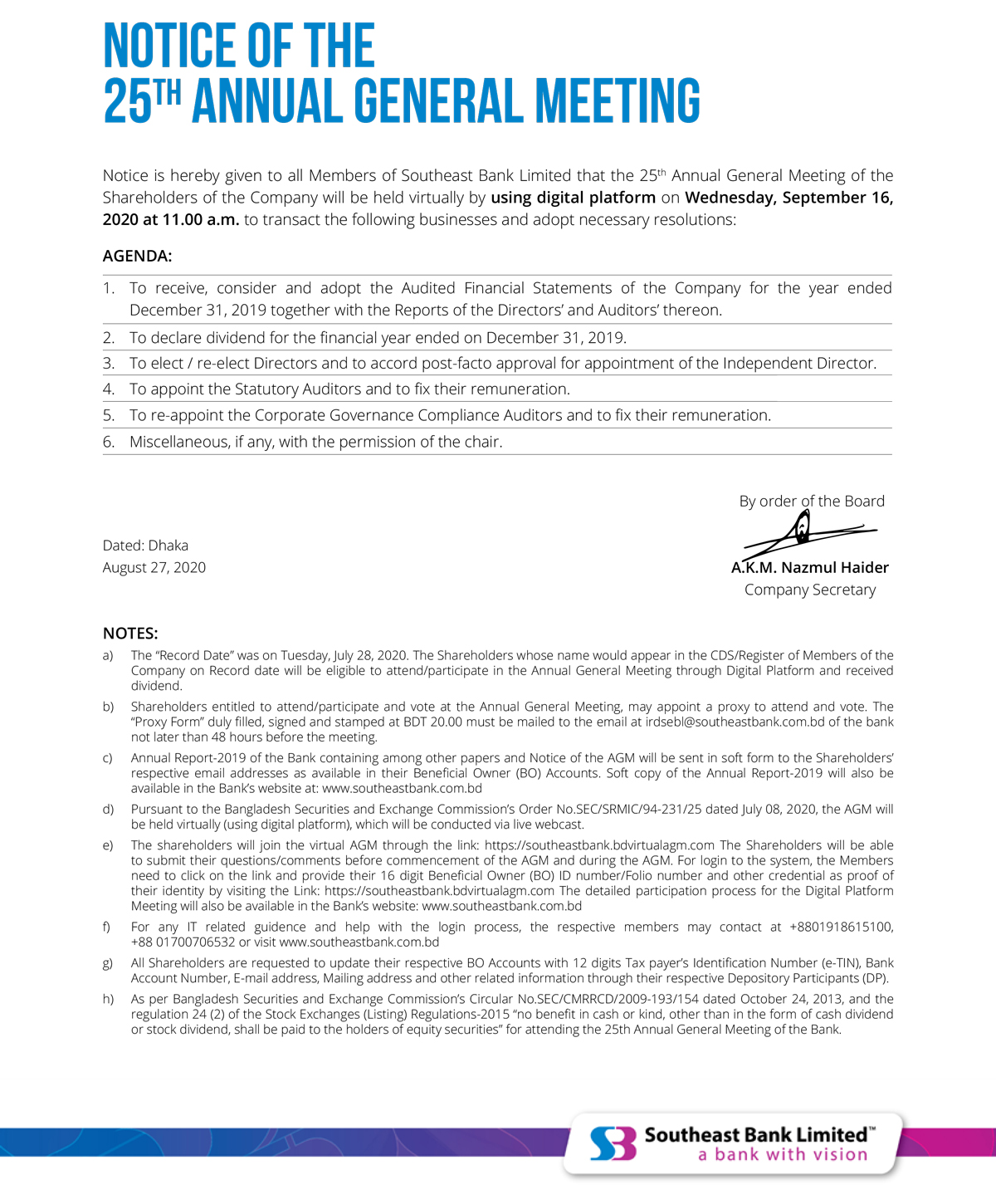 Notice of the 25th AGM of Southeast Bank Ltd.