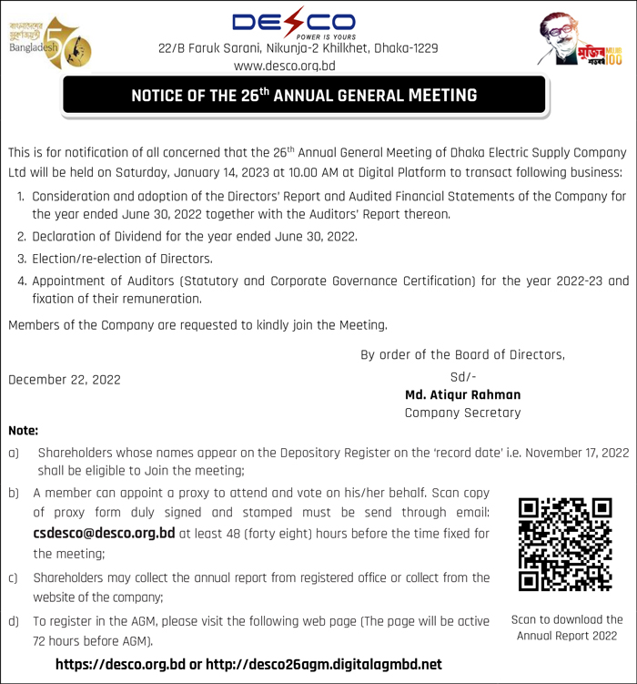Notice of the 26th AGM of Dhaka Electric Supply Company Ltd