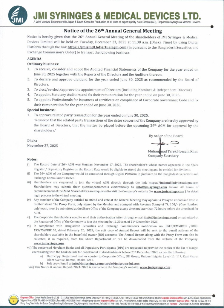 Notice of the 26th AGM of JMI Syringes & Medical Devices Ltd.