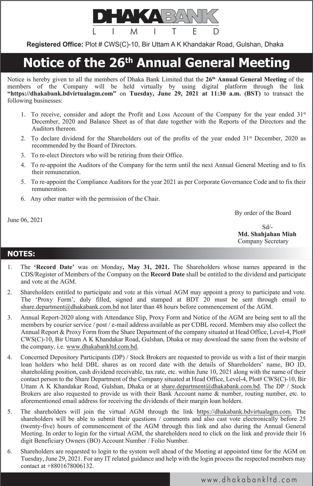Notice of the 26th Annual General Meeting of Dhaka Bank