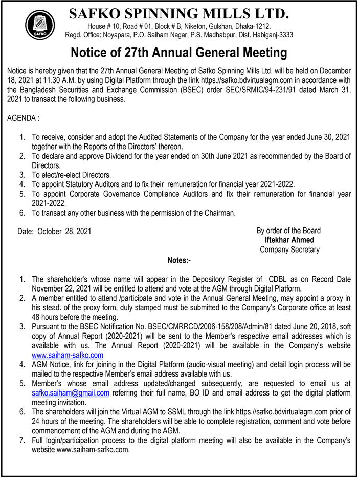 Notice of the 27th AGM of Safko Spinnings Mills Ltd.