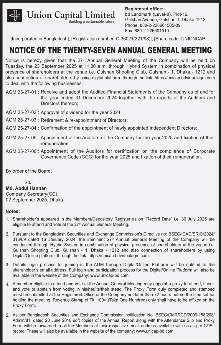Notice of the 27th AGM of Union Capital Limited
