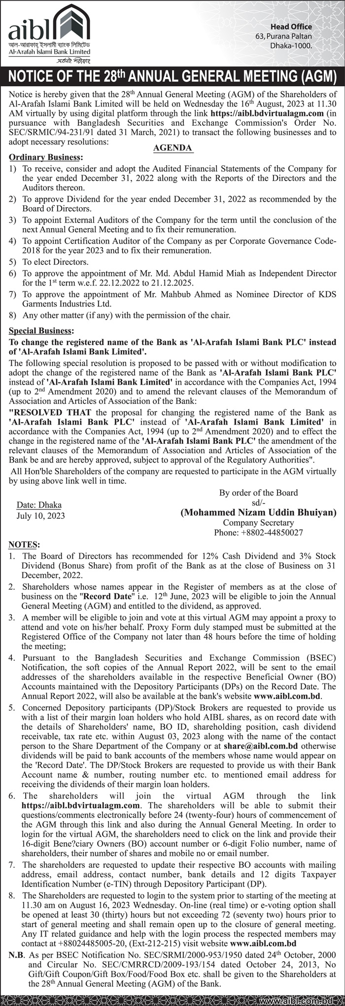 Notice of the 28th AGM of Al-Arafah Islami Bank Limited