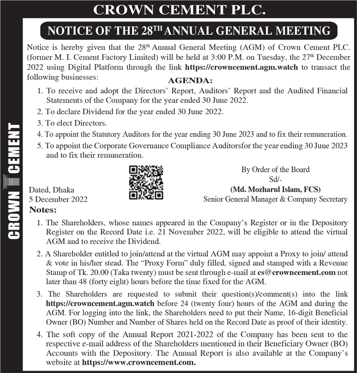 Notic to the Shareholders to claim the Uclaimed Dividend of Crown Cement PLC