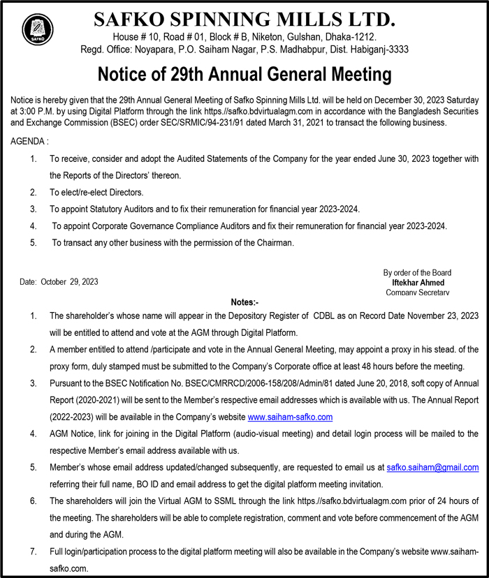 Notice of the 29th AGM of SAFKO Spinning Mills Limited