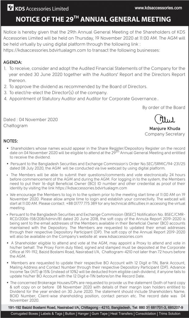 Notice Of the 29th Annual General Meeting Of KDS Accessories