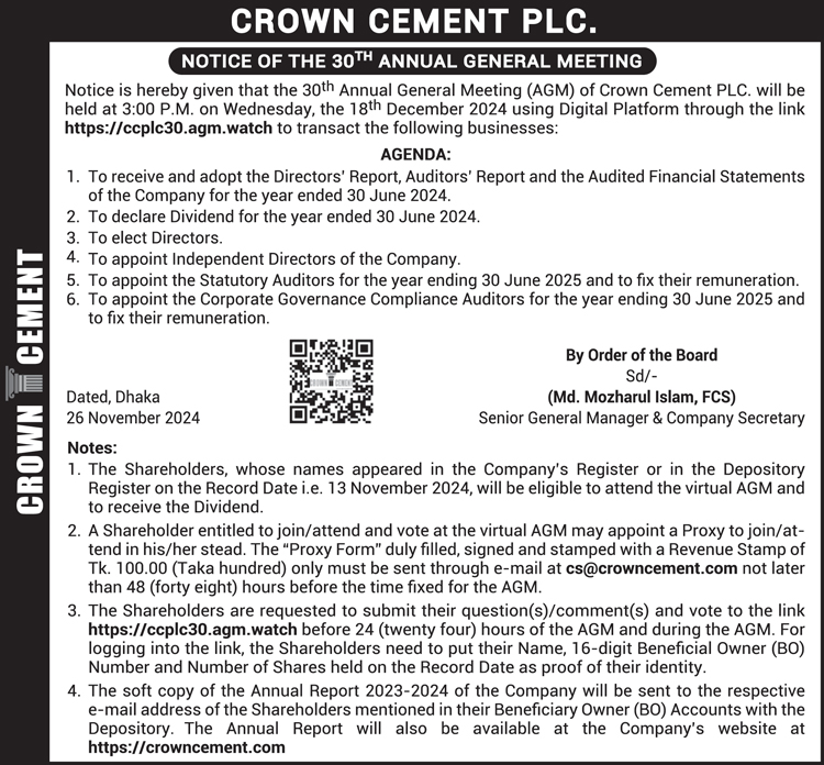 Notic to the Shareholders to claim the Uclaimed Dividend of Crown Cement PLC
