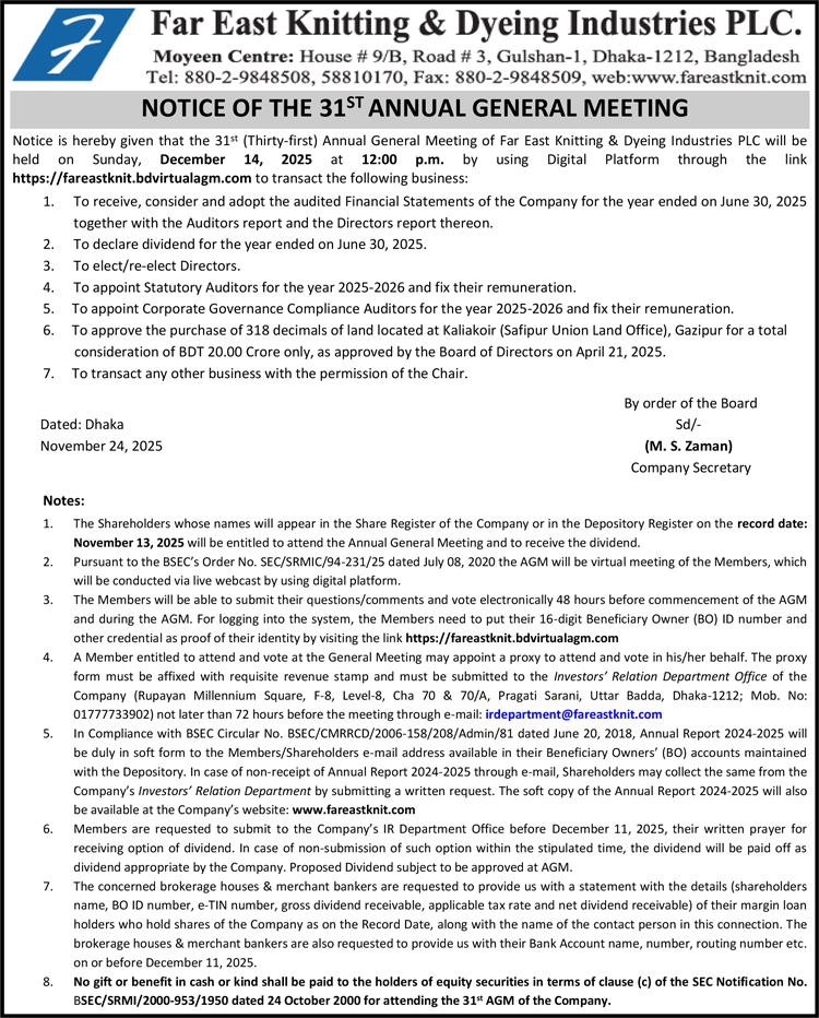 Notice of the 31st AGM of Far East Knitting & Dyeing Industries PLC.