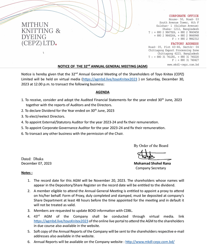 Notice of the 32nd AGM of Mithun Knitting & Dyeing (CEPZ) Ltd.