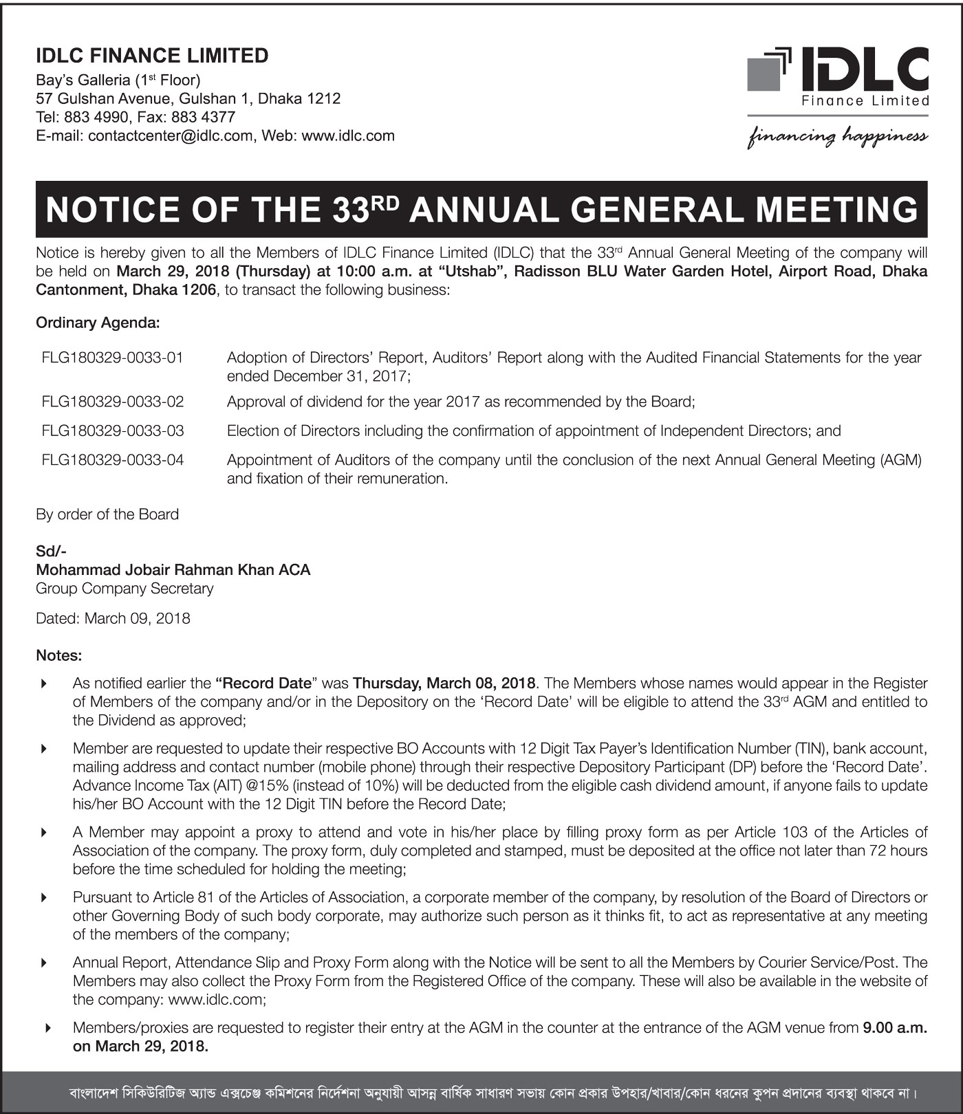 Notice of the 33rd Annual General Meeting of IDLC Finance Limited