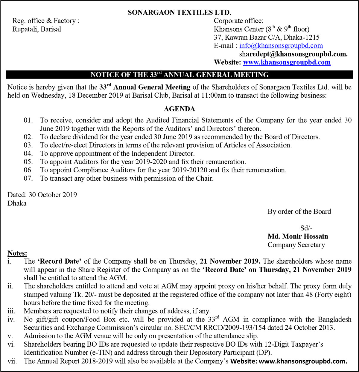 Notice of the 33rd Annual General Meeting of Sonargaon Textiles Ltd.
