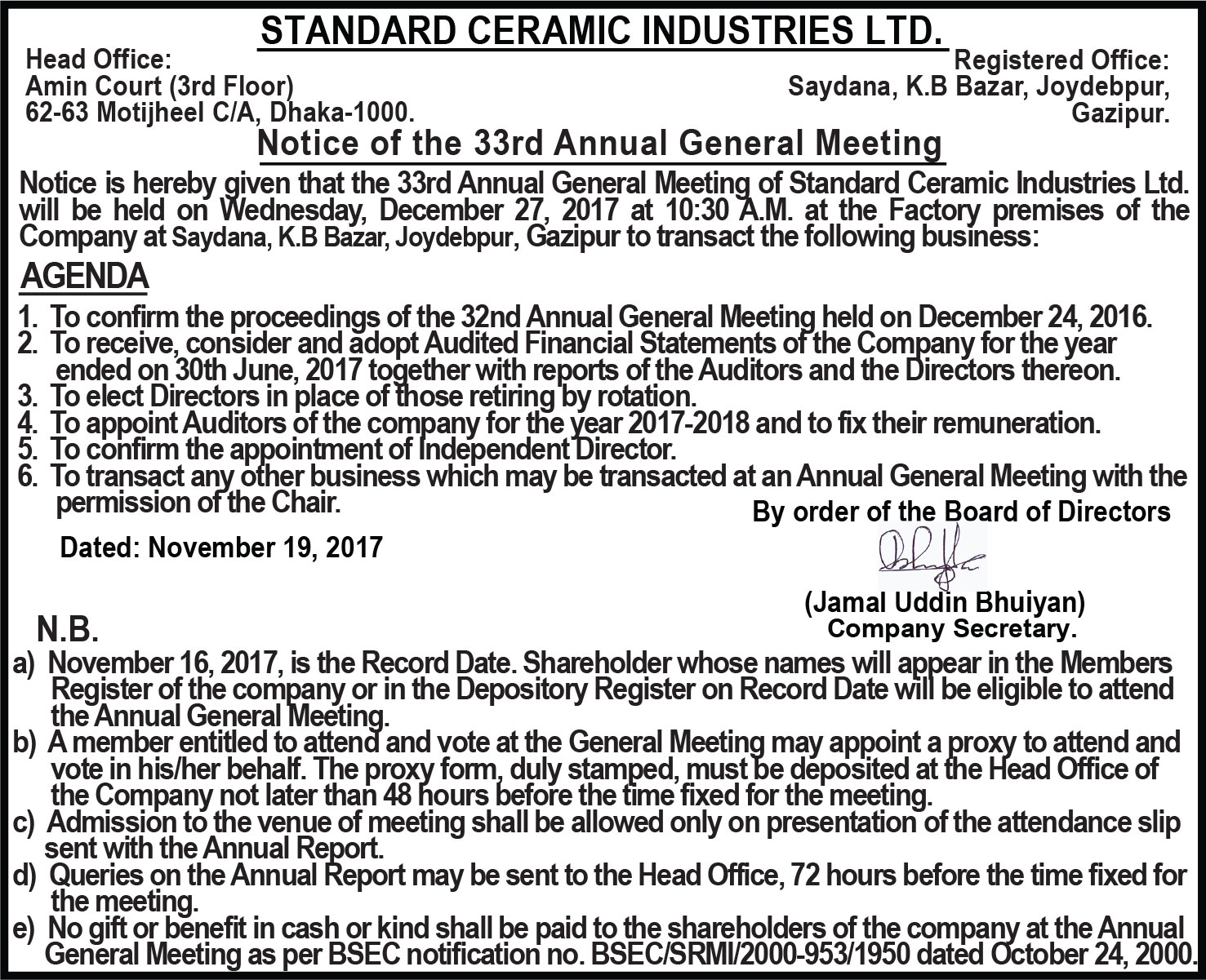 Notice of the 33rd Annual General Meeting of Standard Ceramic Industries Ltd.