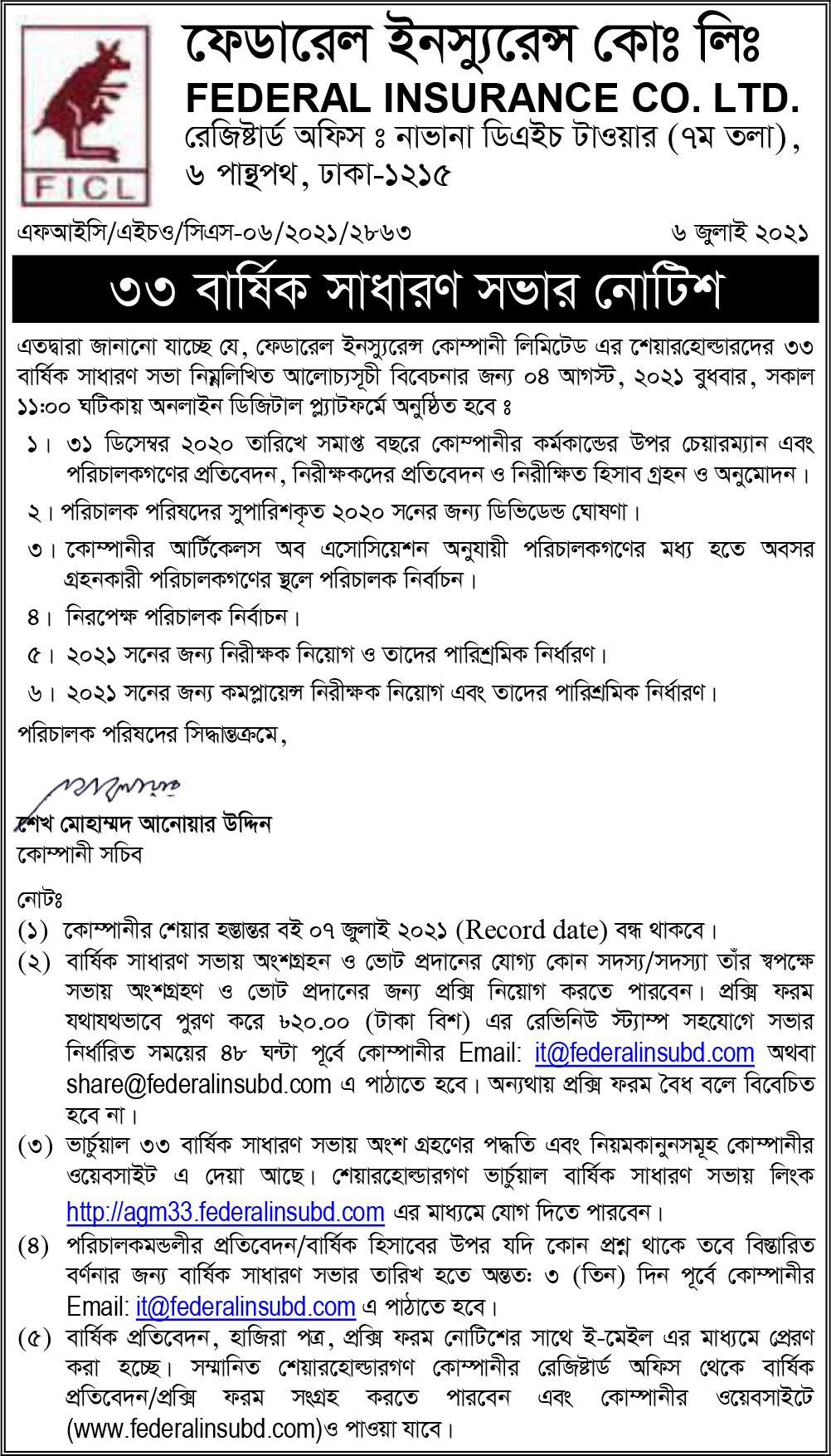 Notice of the 33th AGM Federal Insurance Co. Ltd.
