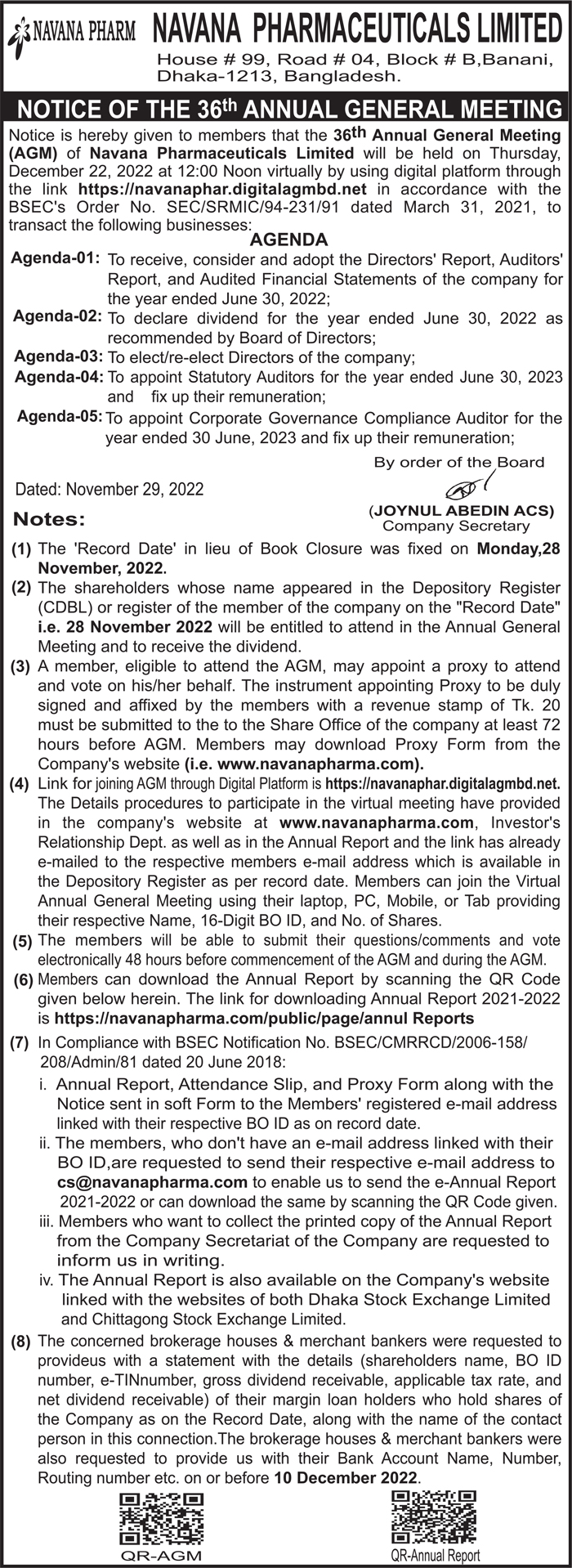 Notice of the 36th AGM of Navana Pharmaceuticals Ltd