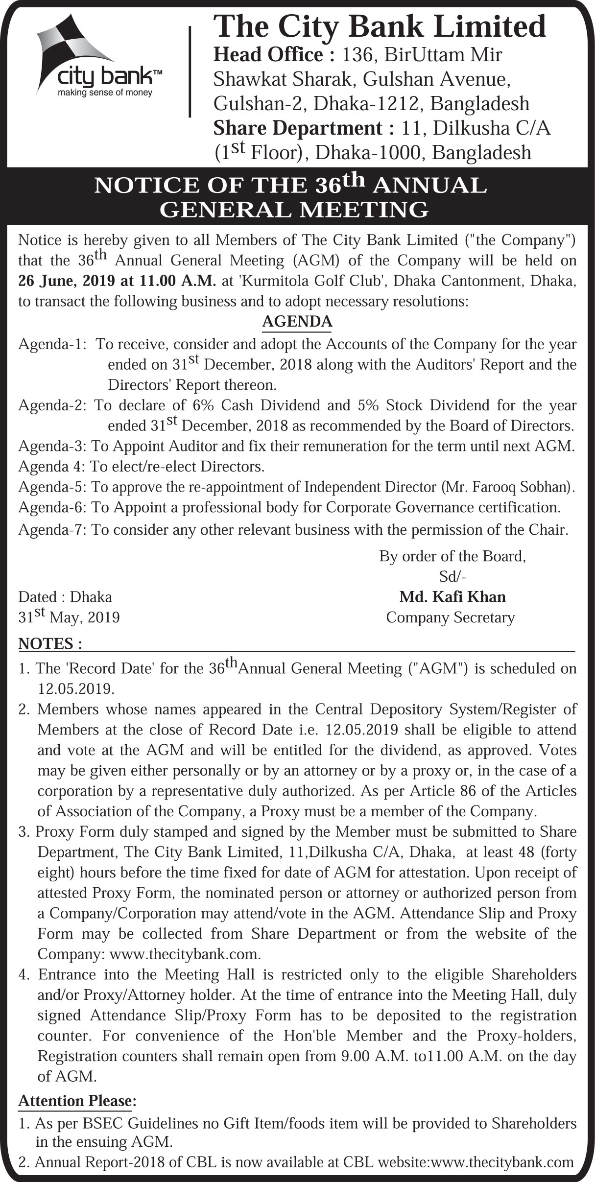 Notice of the 36th Annual General Meeting of The City Bank Ltd.