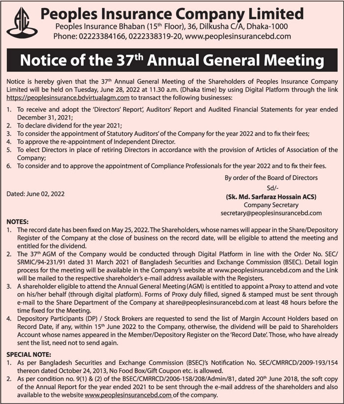 Notice of the 37th AGM of Peoples Insurance Company Limited