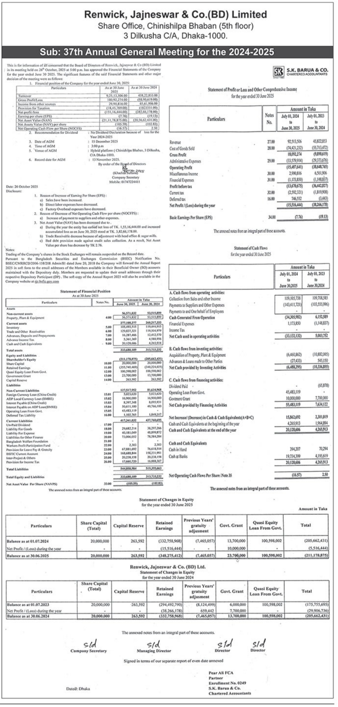 Notice of the 37th AGM of Renwick, Jajneswar & Co.(BD) Limited