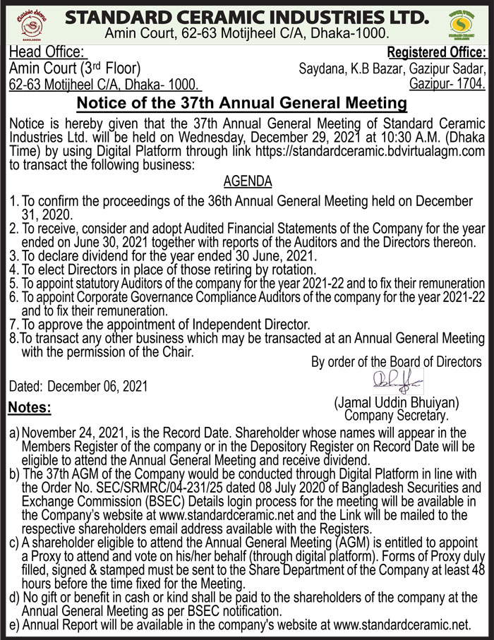 Notice of the 37th AGM of Standard Ceramic Industries Ltd.