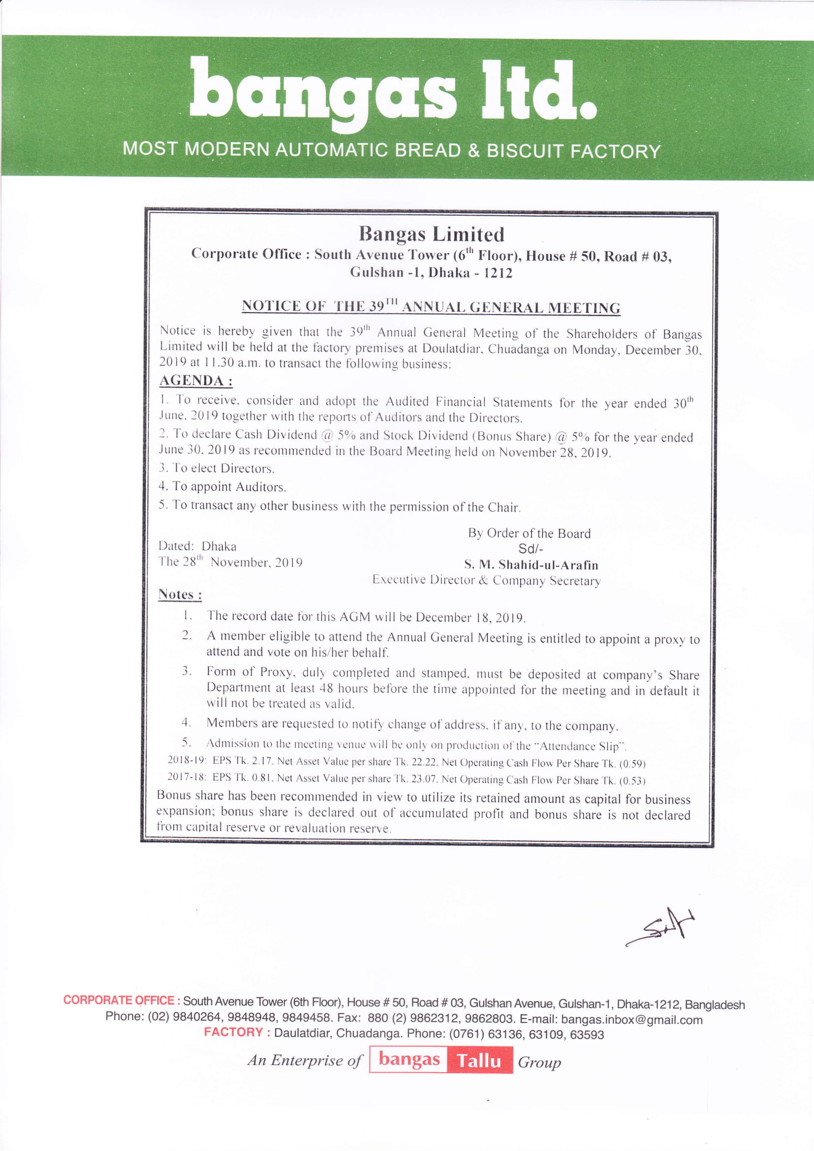 Notice of the 39th Annual General Meeting of Bangas Ltd.