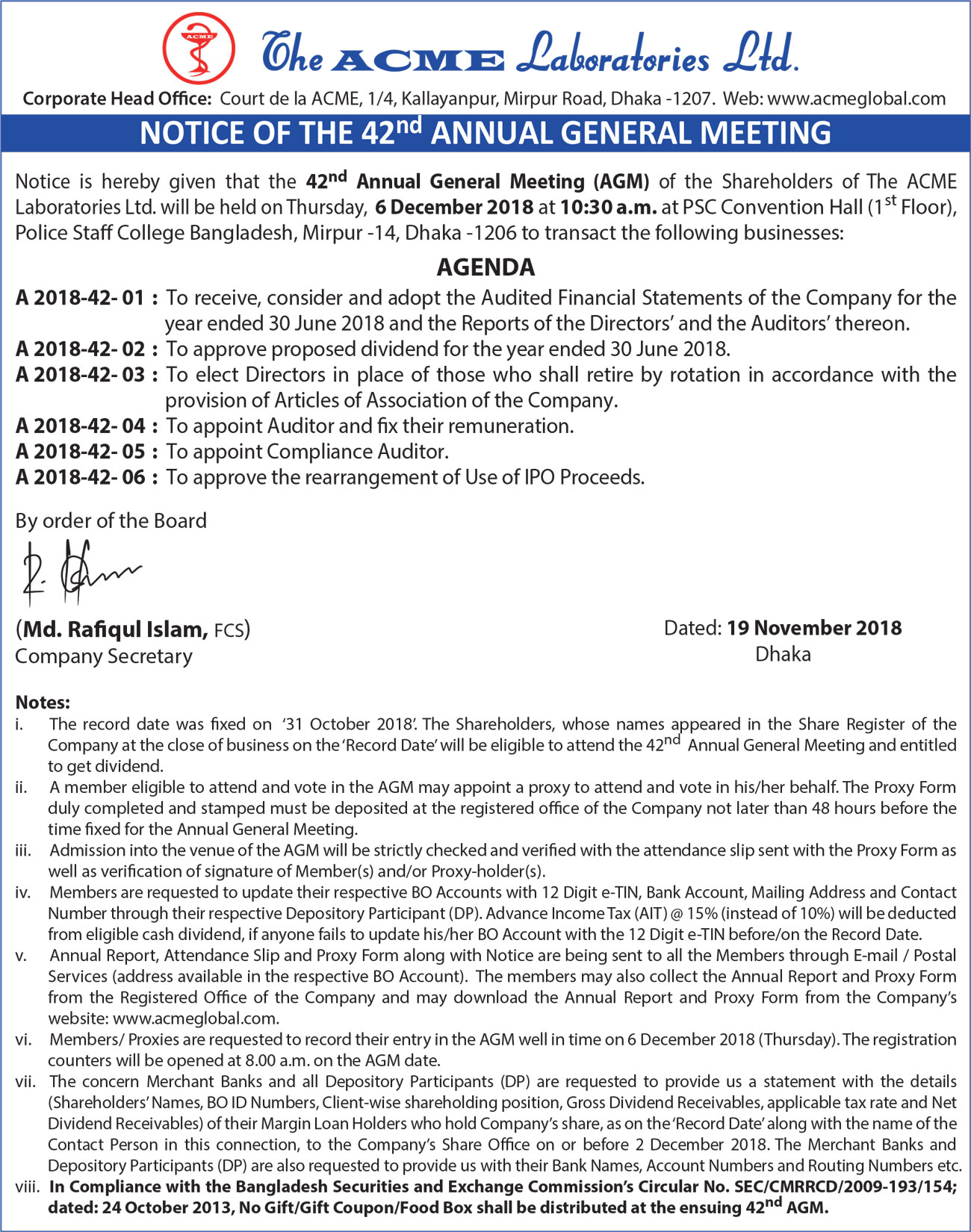 Notice of the 42nd AGM of The ACME Laboratories Ltd.