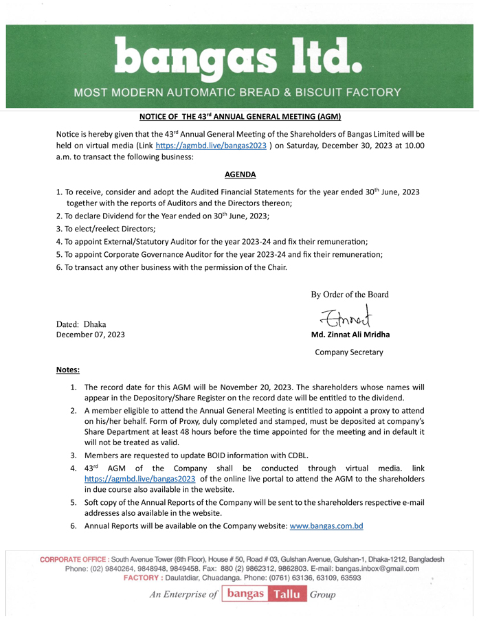 Notice of the 43rd AGM of Bangas Ltd.