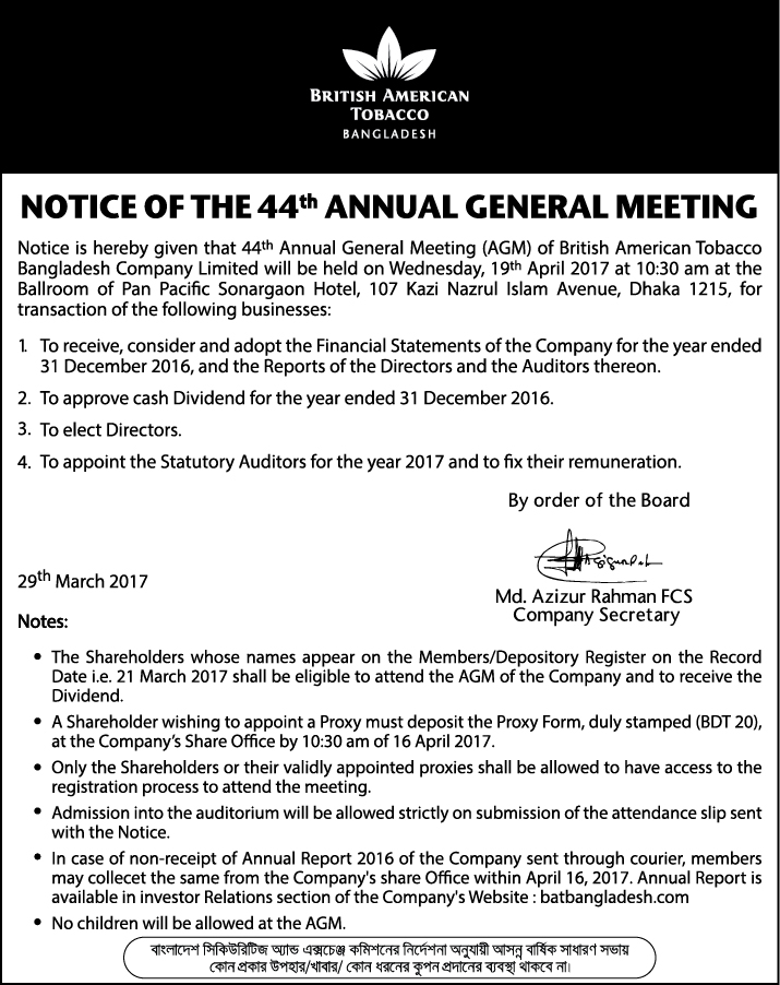 Notice of the 44th Annual General Meeting of British American Tobacco Bangladesh