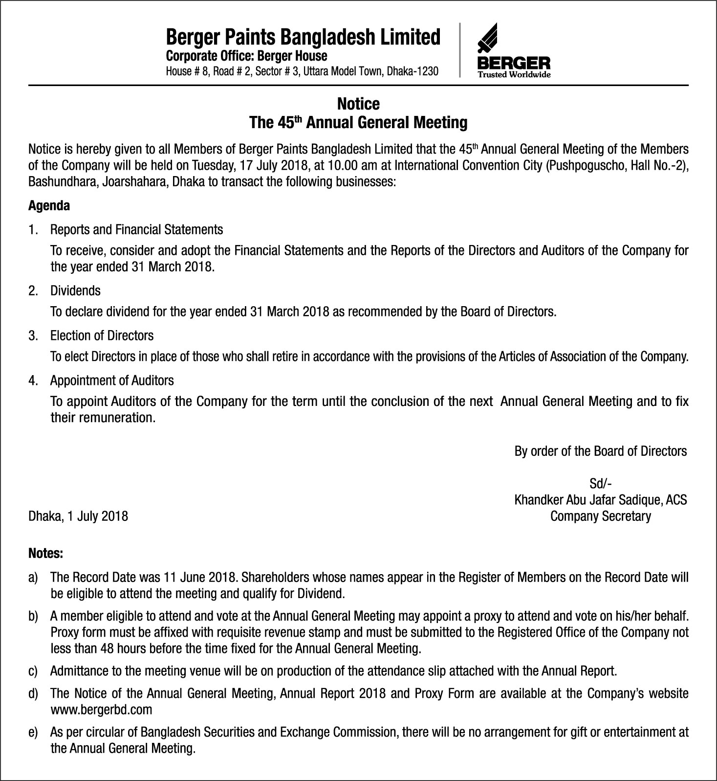 Notice of the 45th Annual General Meeting of Berger Paints Bangladesh Ltd