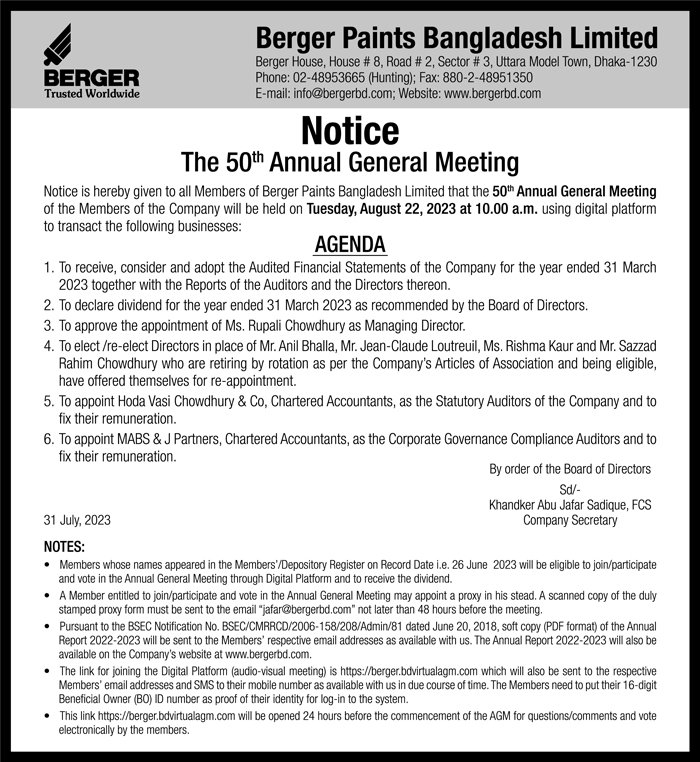 Notice of the 50th AGM of Berger Paints Bangladesh Limited