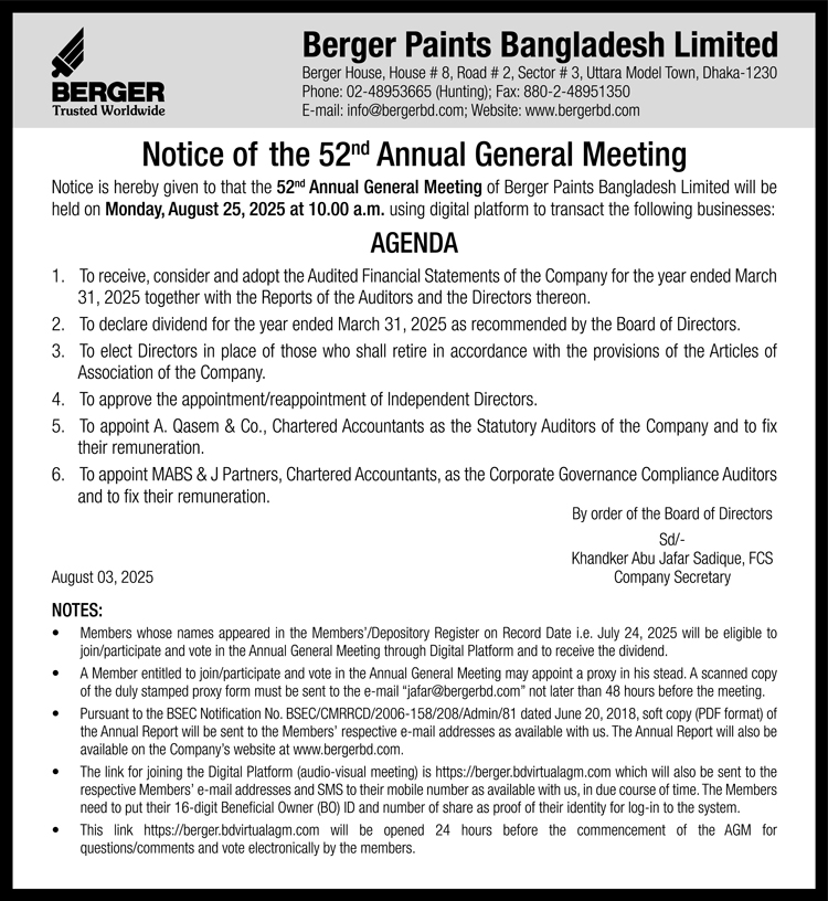 Notice of the 52nd AGM of Berger Paints Bangladesh Limited