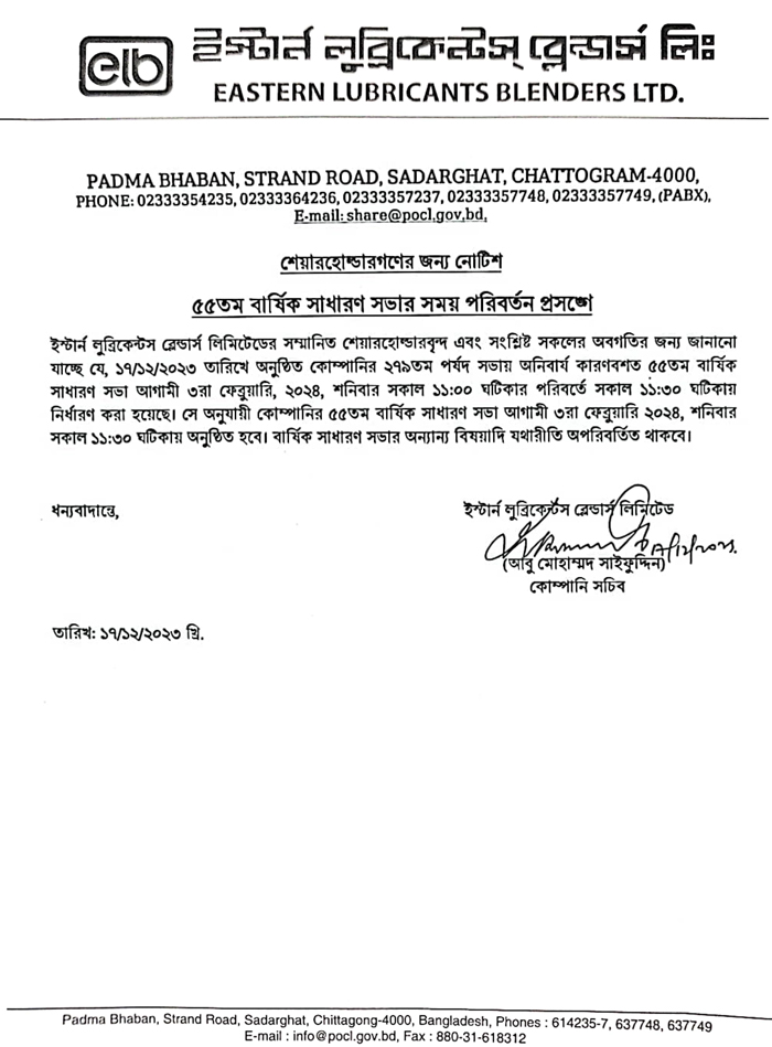 Notice of the 55th AGM of Eastern Lubricants Blenders Limited