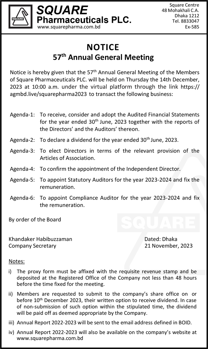Notice of the 57th AGM of Square Pharmaceuticals PLC