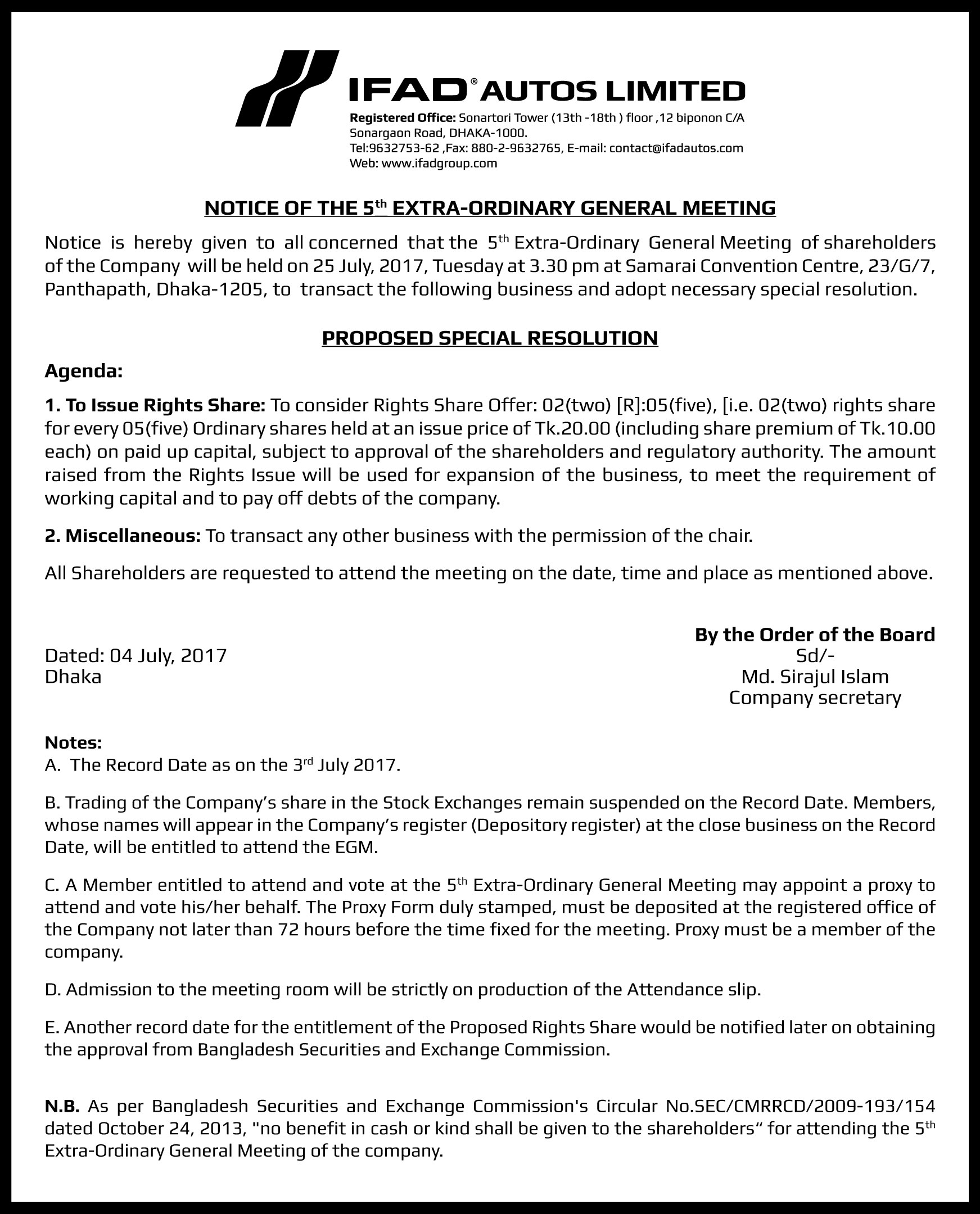 Notice of the 5th Extra-Ordinary General Meeting of IFAD Autos
